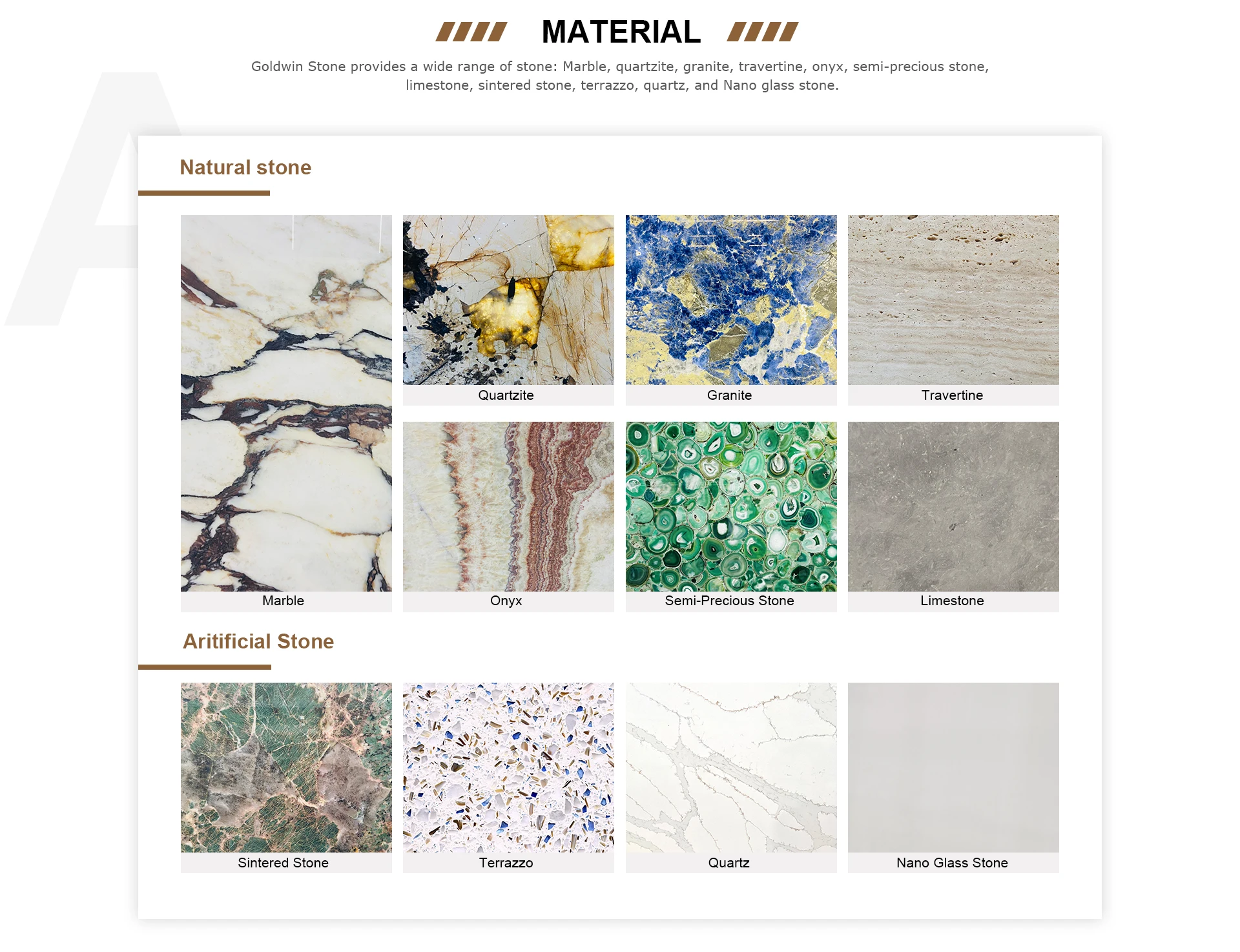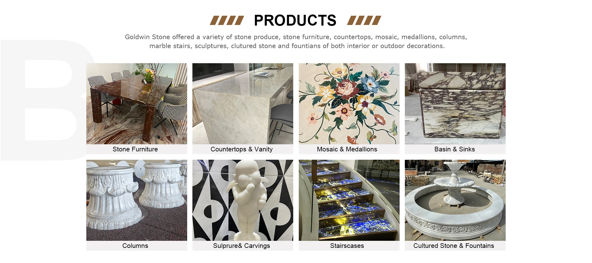 Operating since 1999, Xiamen Goldwin Stone Factory covers 2,500 m² and is a premier source for premium stone. We mass-produce marble tiles, quartzite countertops, columns, stairs, architraves, entrance stones, engravings and medallions with world-class precision. Bridge saws slice large slabs, beveled machines craft elegant edges, and column machines shape flawless pillars. Five-axis smart CNC executes intricate patterns, GMM polishers deliver mirror finishes, and waterjets carve delicate motifs. This integrated technology, guided by a seasoned workforce, guarantees every piece meets exacting design and durability standards for residential, hospitality and commercial projects worldwide.